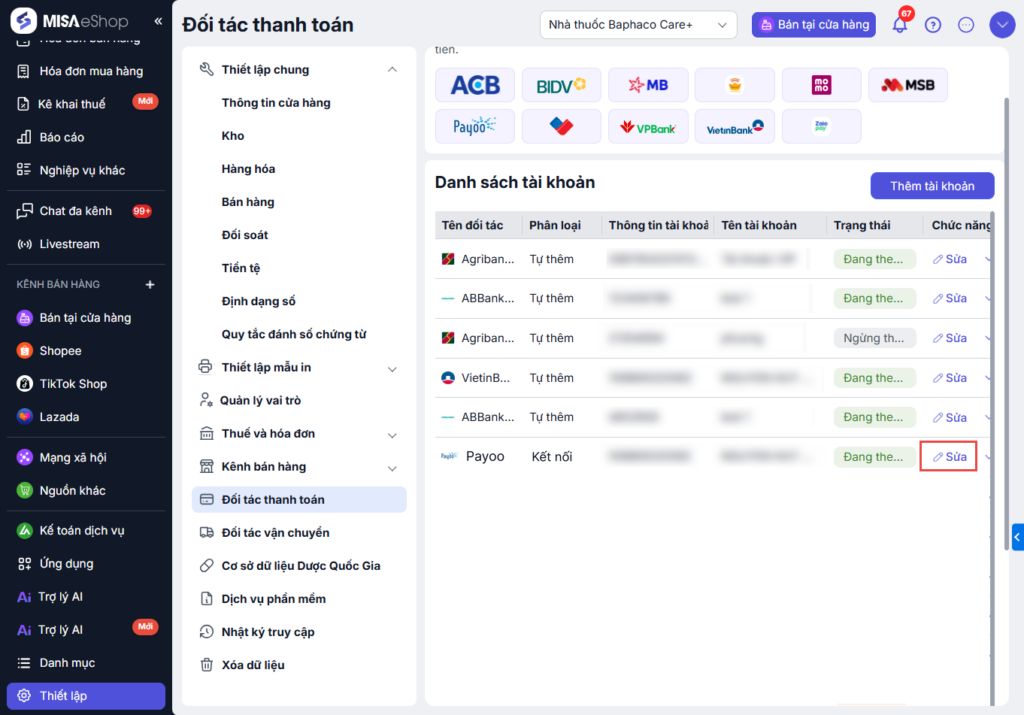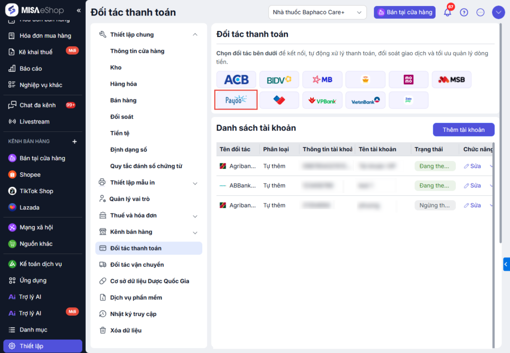 Tại trang quản lý, chọn Thiết lập\Đối tác thanh toán.