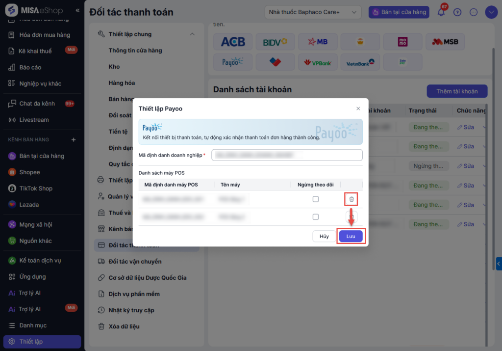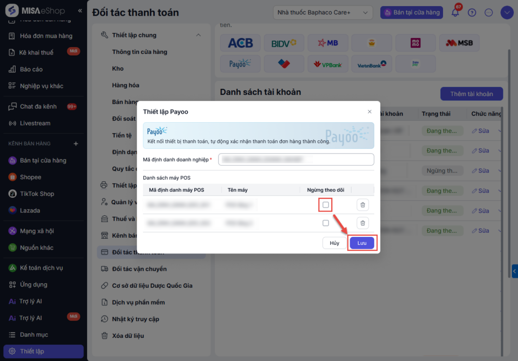 - Tạm ẩn tài khoản máy POS Payoo khỏi màn thanh toán: tích chọn Ngừng theo dõi.