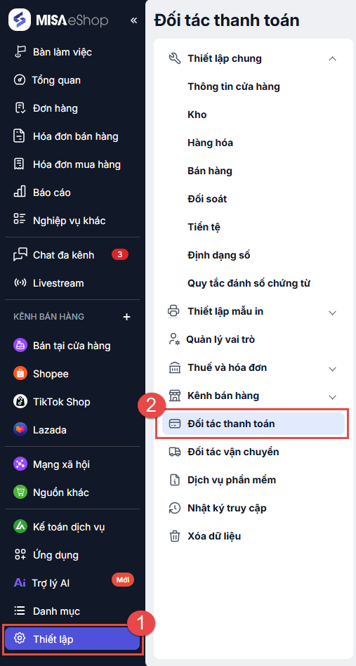 Bước 1. Truy cập thiết lập đối tác thanh toán