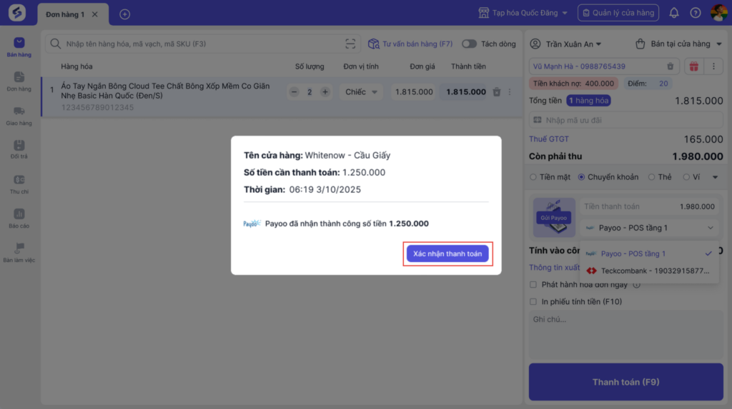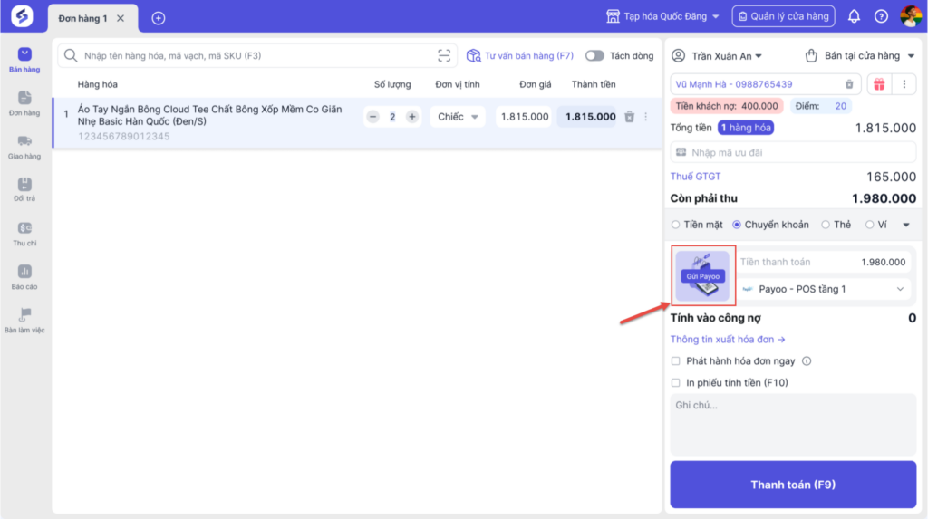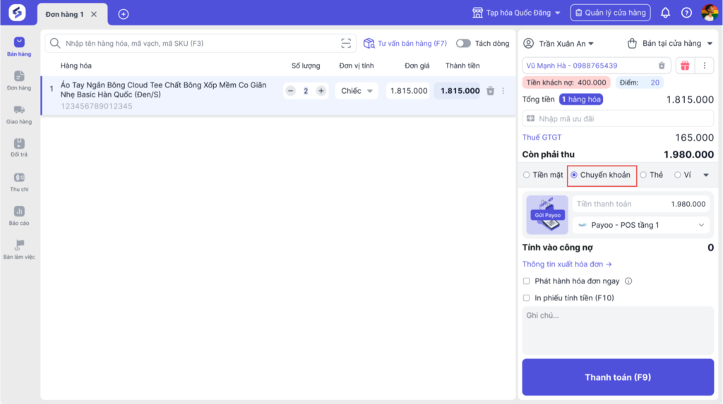 Sau khi thêm hàng hóa và thông tin khách hàng, chọn phương thức thanh toán Chuyển khoản.