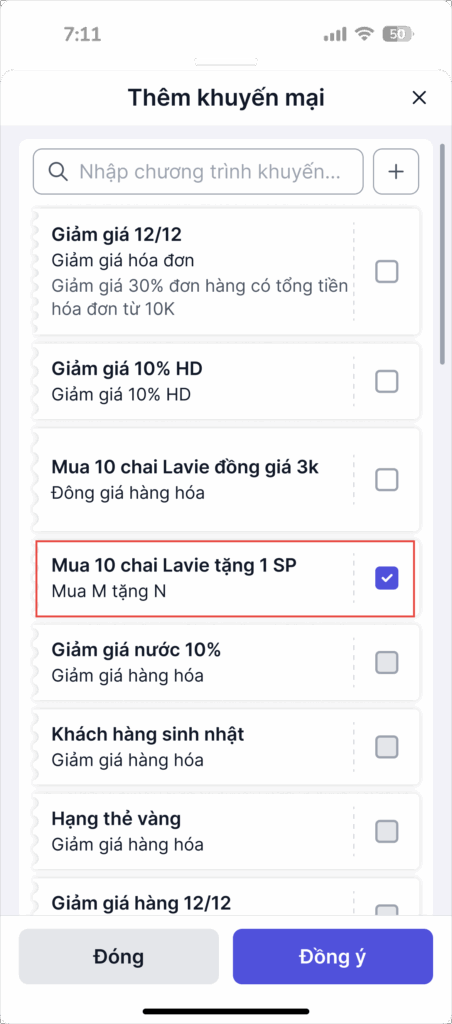 - Danh sách các chương trình khuyến mại áp dụng xuất hiện, chọn chương trình Tặng hàng muốn áp dụng, sau đó nhấn Đồng ý.