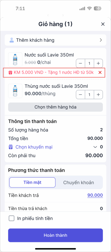 - Ngay sau khi chọn và xác nhận, hệ thống sẽ áp dụng chương trình khuyến mại vào đơn hàng với đầy đủ thông tin về sản phẩm tặng, số lượng và giá trị sẽ hiển thị rõ ràng trong danh sách sản phẩm của đơn hàng.