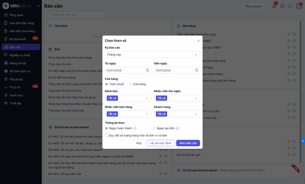 Sau khi thiết lập xong các tham số, nhấn Xem báo cáo.