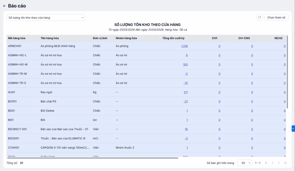 - Cửa hàng: Tổng số lượng tồn cuối kỳ của từng cửa hàng có trên báo cáo