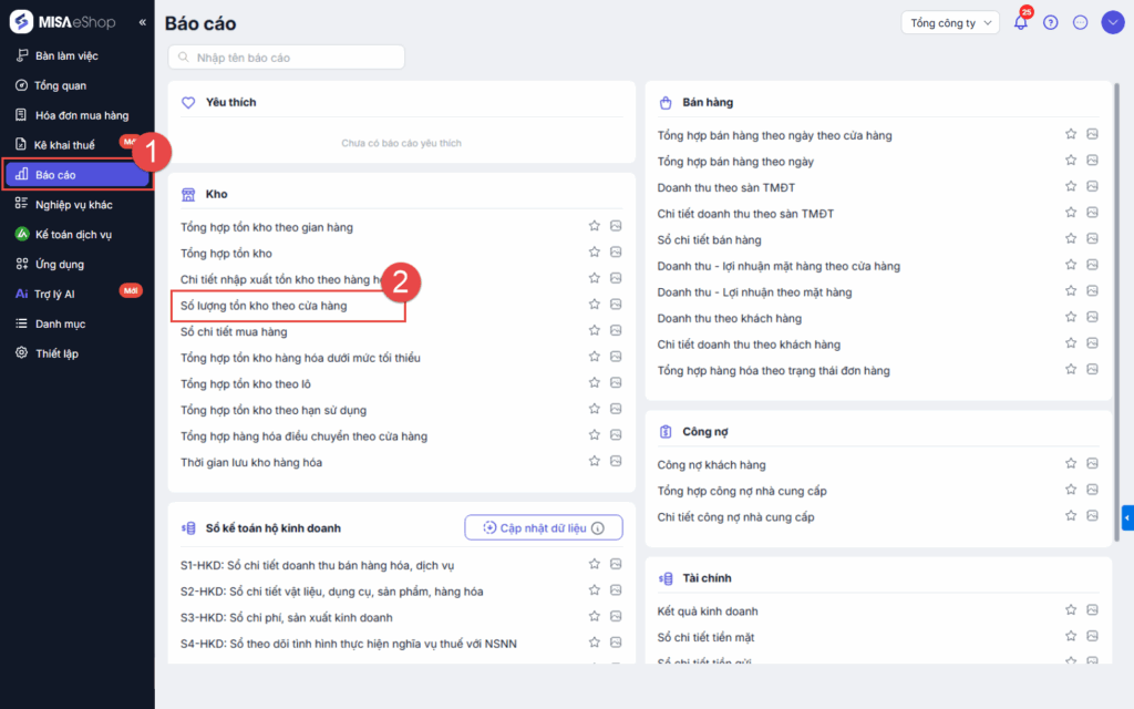 Bước 1: Truy cập trang Báo cáo, chọn báo cáo Tổng hợp tồn kho theo cửa hàng