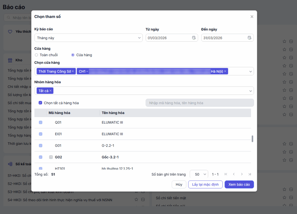 - Lưu ý: Nếu đã chọn Hàng hóa rồi và quay lại chọn lại Cửa hàng thì hệ thống sẽ lấy lên lại danh sách hàng hóa theo cửa hàng mới, người dùng cần thực hiện chọn lại hàng hóa để xem báo cáo.