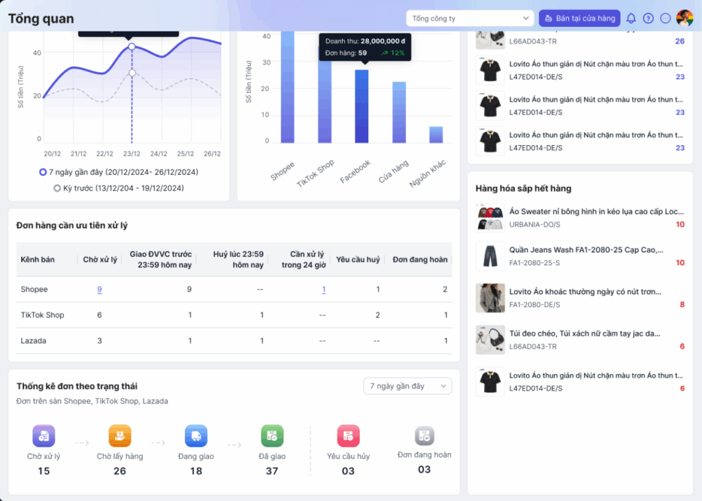 - Lazada, TikTok Shop: Hệ thống thống kê tất cả các đơn phát sinh trong kỳ báo cáo và có trạng thái: Đơn mới, Chờ xử lý, Chờ lấy hàng, Đang giao hàng, Đã giao, Chờ xác nhận, Đã giao – Đã xác nhận.