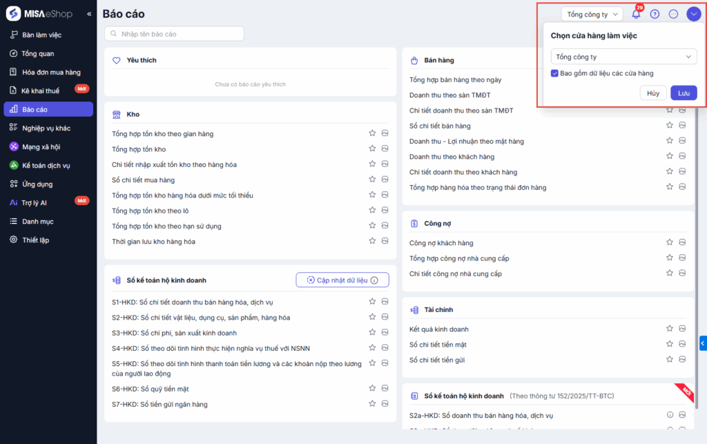 Bài viết hướng dẫn cách xem và thiết lập báo cáo tổng quan tại trang Tổng công ty trong hệ thống MISA AMIS. Nội dung bao gồm các bước truy cập, thiết lập thời gian báo cáo và phân tích các chỉ số kinh doanh của toàn chuỗi. Phạm vi áp dụng cho người dùng có quyền truy cập trang Tổng công ty.
