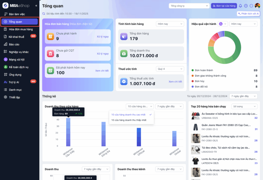 – Doanh thu theo cửa hàng: Lấy tổng doanh thu từng cửa hàng = Tổng tiền đơn hàng hợp lệ phát sinh tại tất cả các kênh bán của cửa hàng đó.