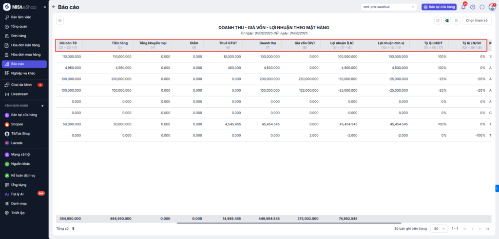 - Khi đó, sẽ xem được báo cáo theo doanh thu, giá vốn, lợi nhuận của từng mặt hàng.