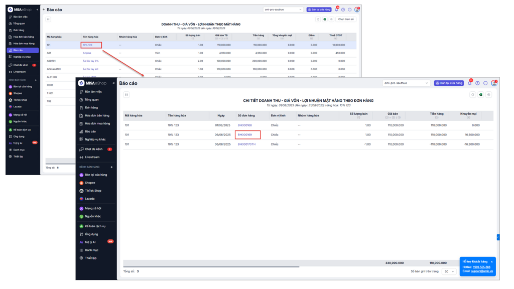 Bài viết hướng dẫn cách kiểm tra, so sánh và phân tích doanh thu, giá vốn, lợi nhuận theo từng mặt hàng trên phần mềm. Nội dung bao gồm các bước xem báo cáo, lựa chọn tham số và tra cứu chi tiết từng đơn hàng. Áp dụng cho các trường hợp cần đánh giá hiệu quả kinh doanh theo mặt hàng.
