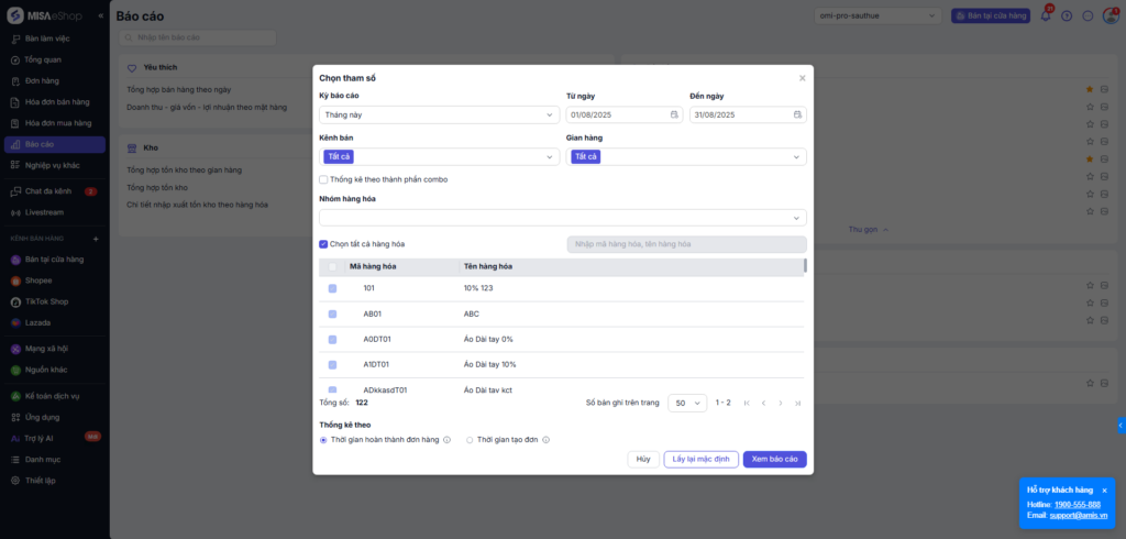 - Kênh bán: Chọn tất cả kênh bán hoặc chọn các kênh bán cần thiết.