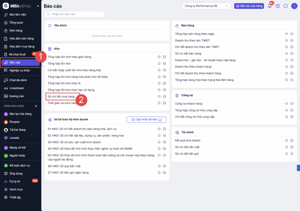 Bước 1: Tại màn hình tổng quan, chọn Báo cáo\Kho\Sổ chi tiết mua hàng