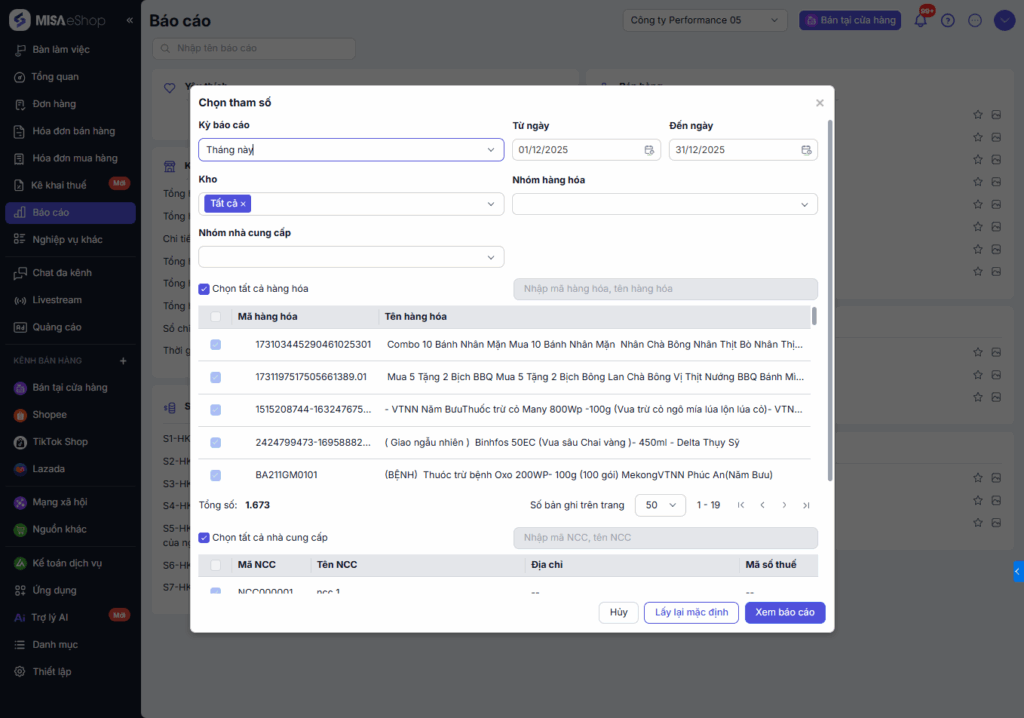 - Nhà cung cấp: Báo cáo theo tất cả hoặc các nhà cung cấp cụ thể.