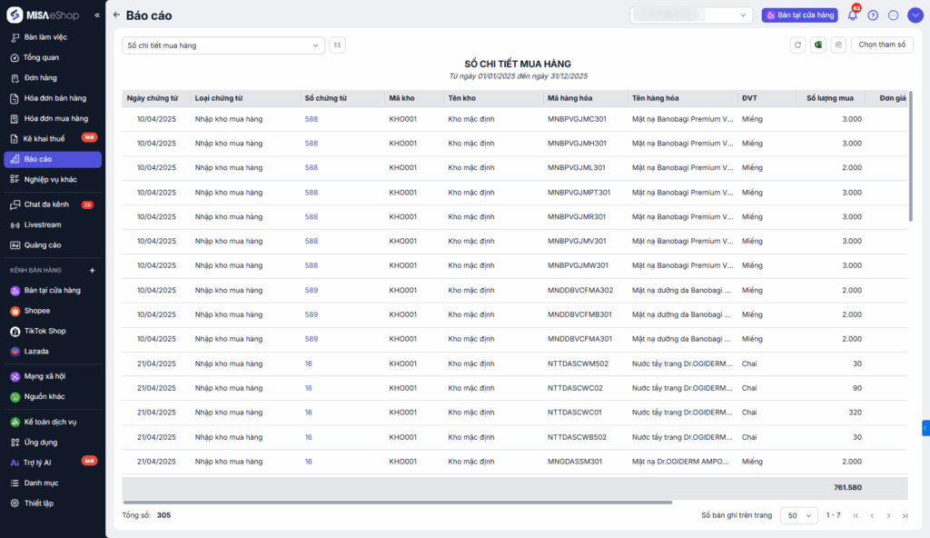 Hệ thống sẽ tổng hợp và hiển thị báo cáo chi tiết các giao dịch mua hàng dựa trên tham số bạn đã chọn. Trên giao diện báo cáo, bạn có thể sử dụng các chức năng sau:
