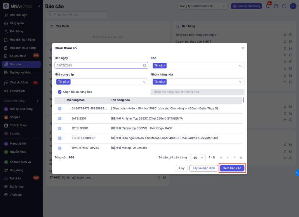 - Tích chọn tất cả hàng hóa trong nhóm hàng hóa đã chọn hoặc tích chọn các hàng hóa trong nhóm để xem báo cáo.