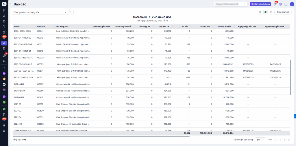 Sau khi hoàn tất, hệ thống sẽ lập bảng báo cáo thời gian lưu kho với thời gian đã chọn.