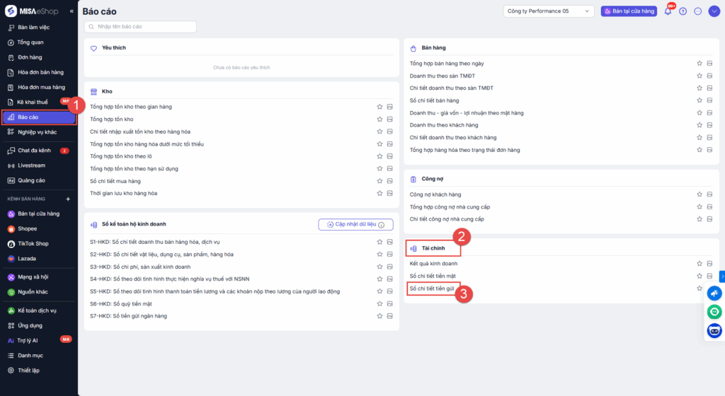 Bước 1: Tại màn hình quản lý, chọn Báo cáo\Tài chính\Sổ chi tiết tiền gửi