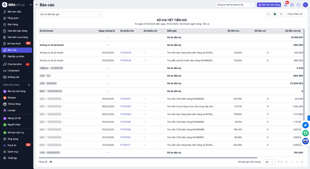 Bước 3: Hệ thống sẽ hiển thị báo cáo chi tiết các khoản thu/chi thông qua tài khoản ngân hàng trong kỳ bạn đã chọn.