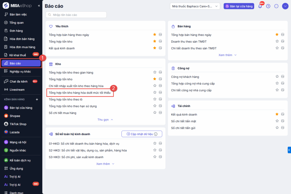Bước 1: Tại màn hình quản lý, chọn Báo cáo\Kho\Tổng hợp tồn kho hàng hóa dưới mức tối thiểu