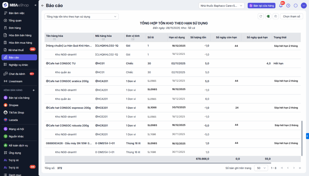 Bước 3: Báo cáo hiển thị tồn kho theo từng Hạn sử dụng với số lô tương ứng của các hàng hóa tại kho đã chọn.