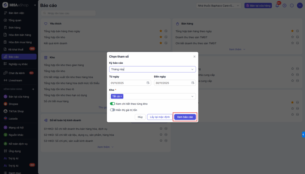 - Kho: Chọn tất cả kho hoặc chọn kho cần báo cáo.