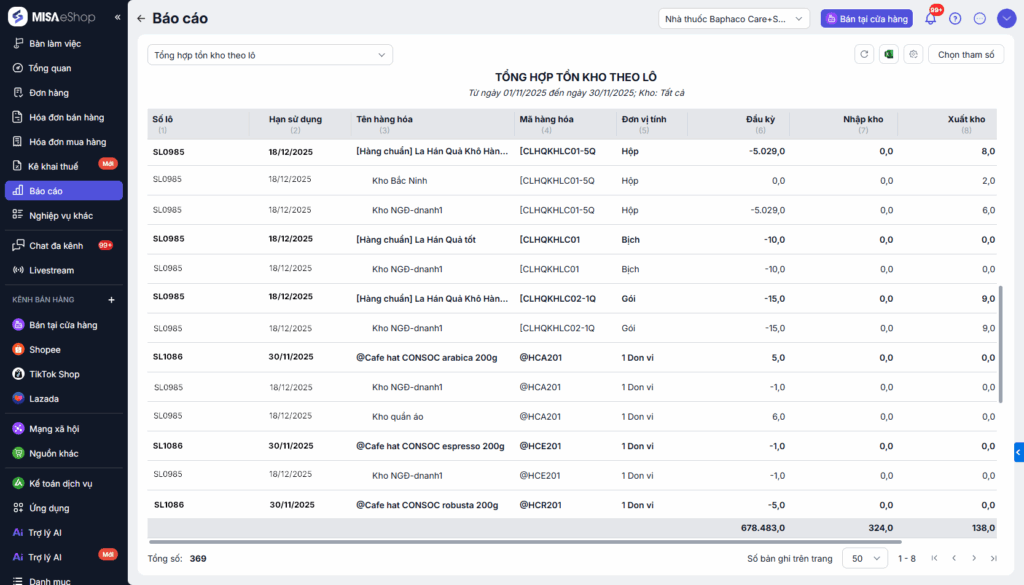 Bước 3: Báo cáo hiển thị tồn kho theo từng Lô và Hạn sử dụng cho các hàng hóa tại kho đã chọn, kèm số lượng và giá trị tồn (nếu bật).