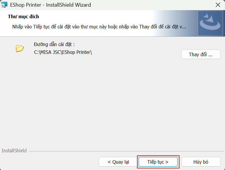 - Nếu muốn đổi, nhấn Thay đổi để chọn thư mục khác → nhấn Tiếp tục.