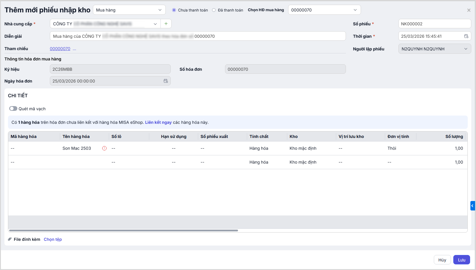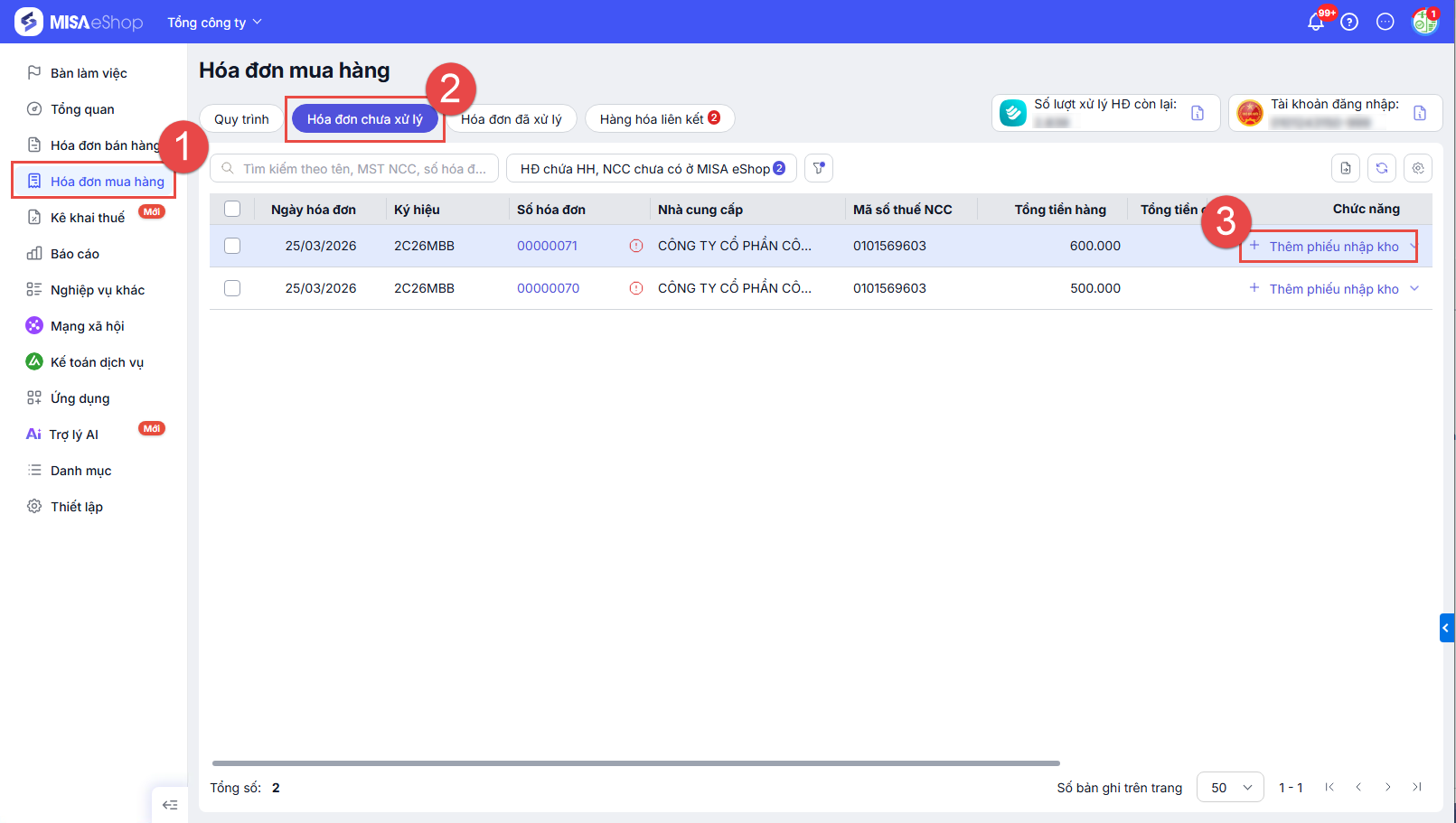 2.2 Xử lý hóa đơn – Tạo nhanh phiếu nhập kho