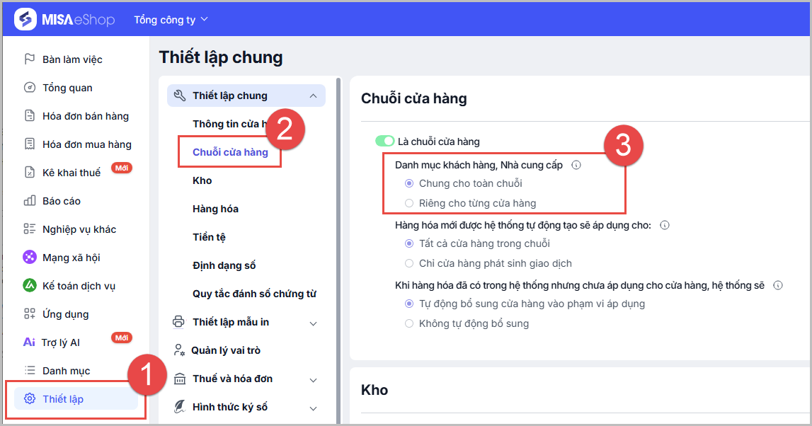 Ứng dụng MISA meInvoice – Xử lý hóa đơn mua hàng sẽ kết nối và lưu riêng tại từng cửa hàng (Tổng công ty sẽ kết nối riêng của Tổng công ty).