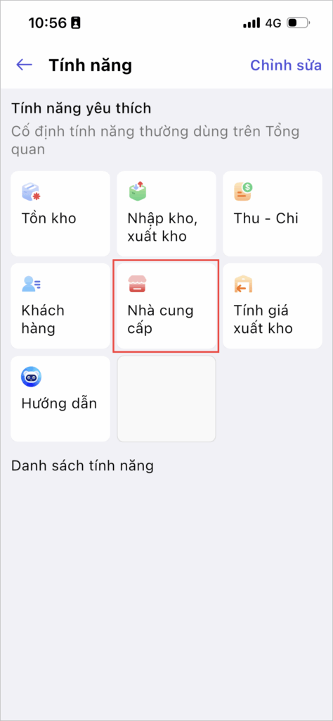 - Tại màn hình tổng quan, chọn tính năng Nhà cung cấp.