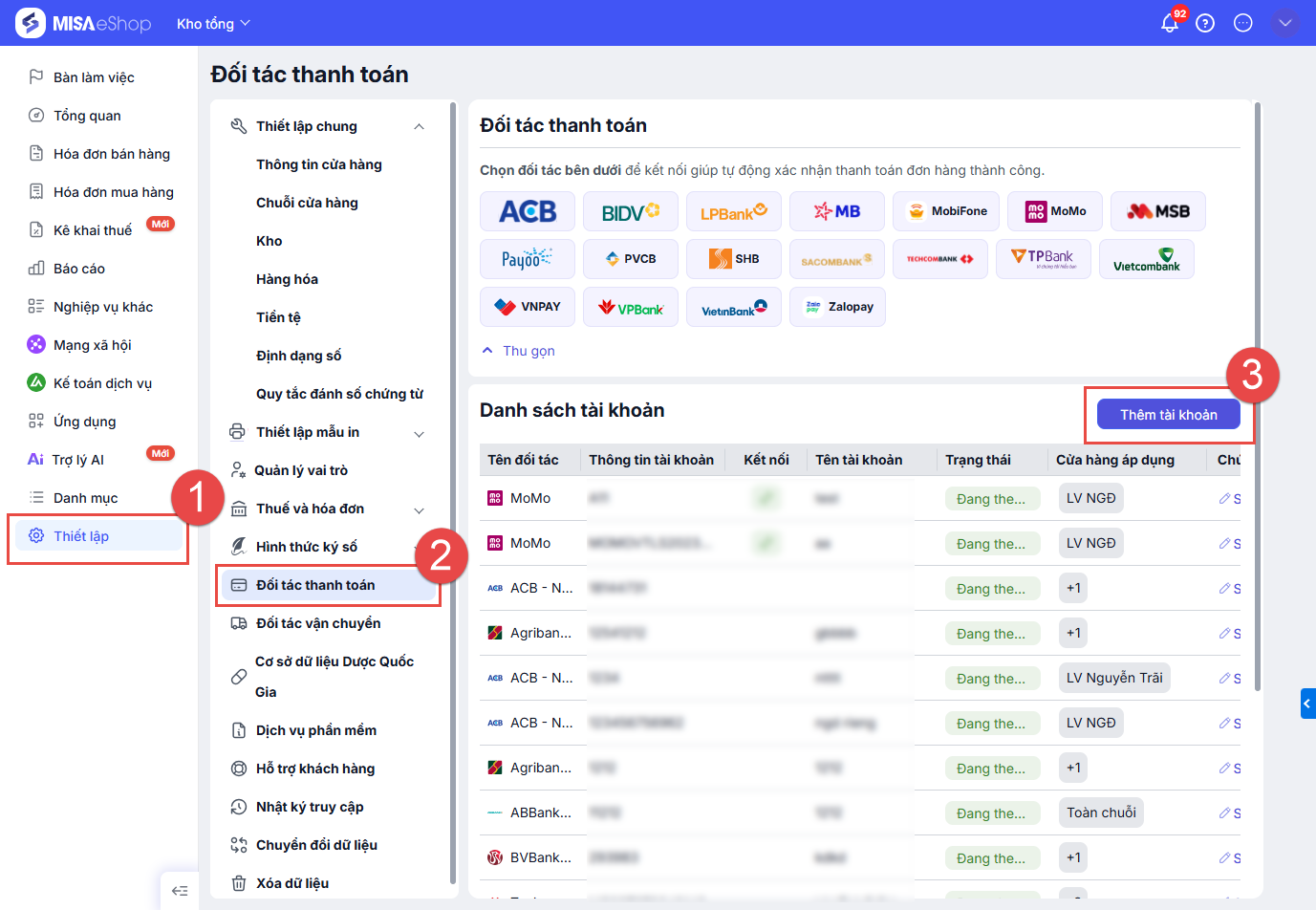 Bước 1: Tại màn hình trang tổng quan, chọn Thiết lập\Đối tác thanh toán, chọn Thêm mới.