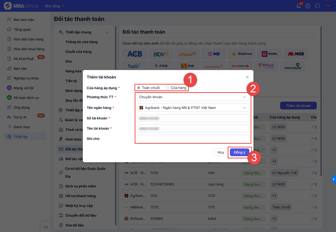 Với các tài khoản tự thêm mới, khi kết nối, cần chọn cửa hàng áp dụng cho tài khoản ngân hàng đó. Các thao tác tự thêm mới tài khoản ngân hàng chi tiết dưới đây: