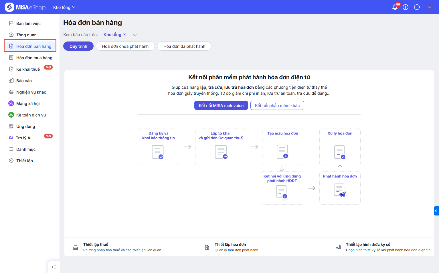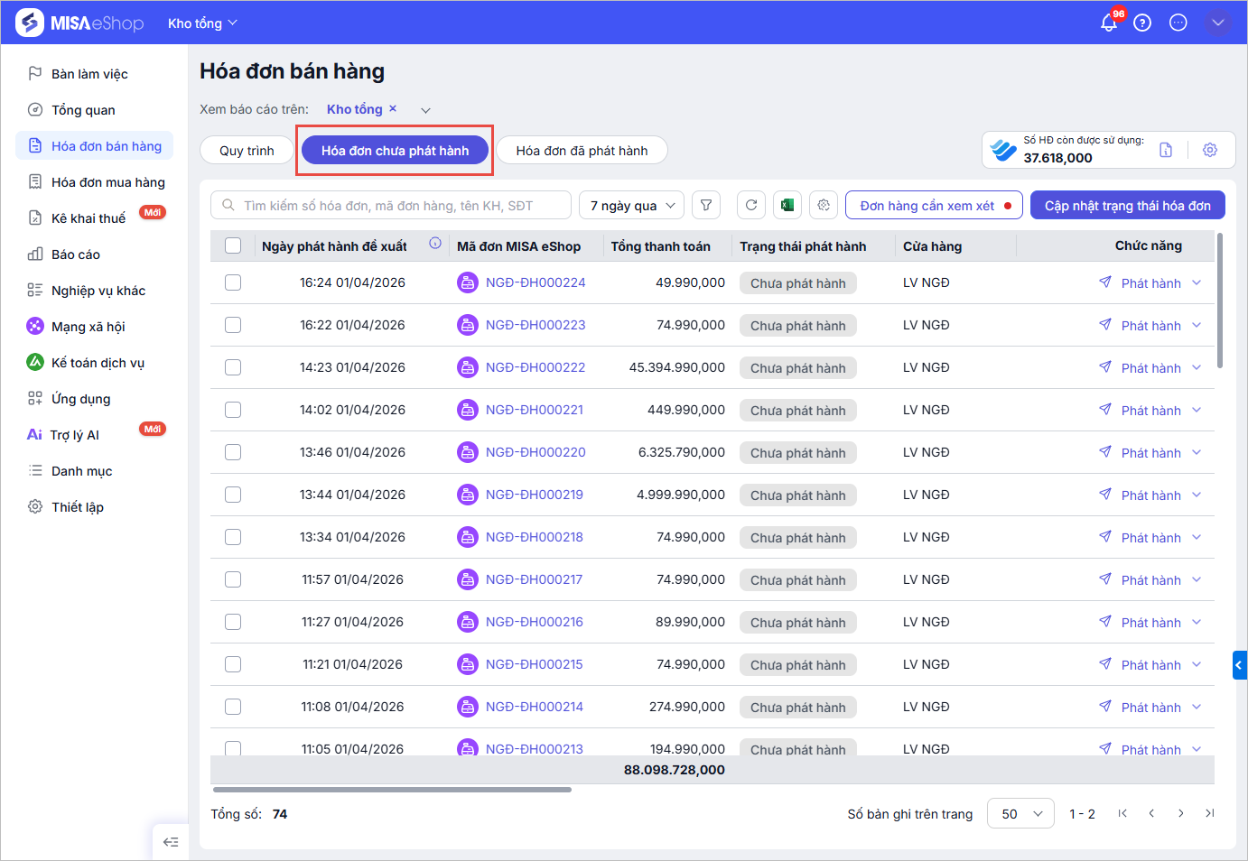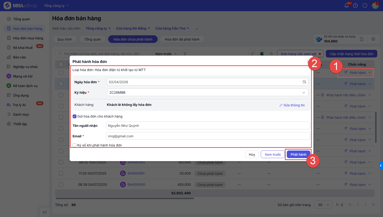 - Phát hành hóa đơn: Thực hiện phát hành hóa đơn tương tự như với cửa hàng đơn