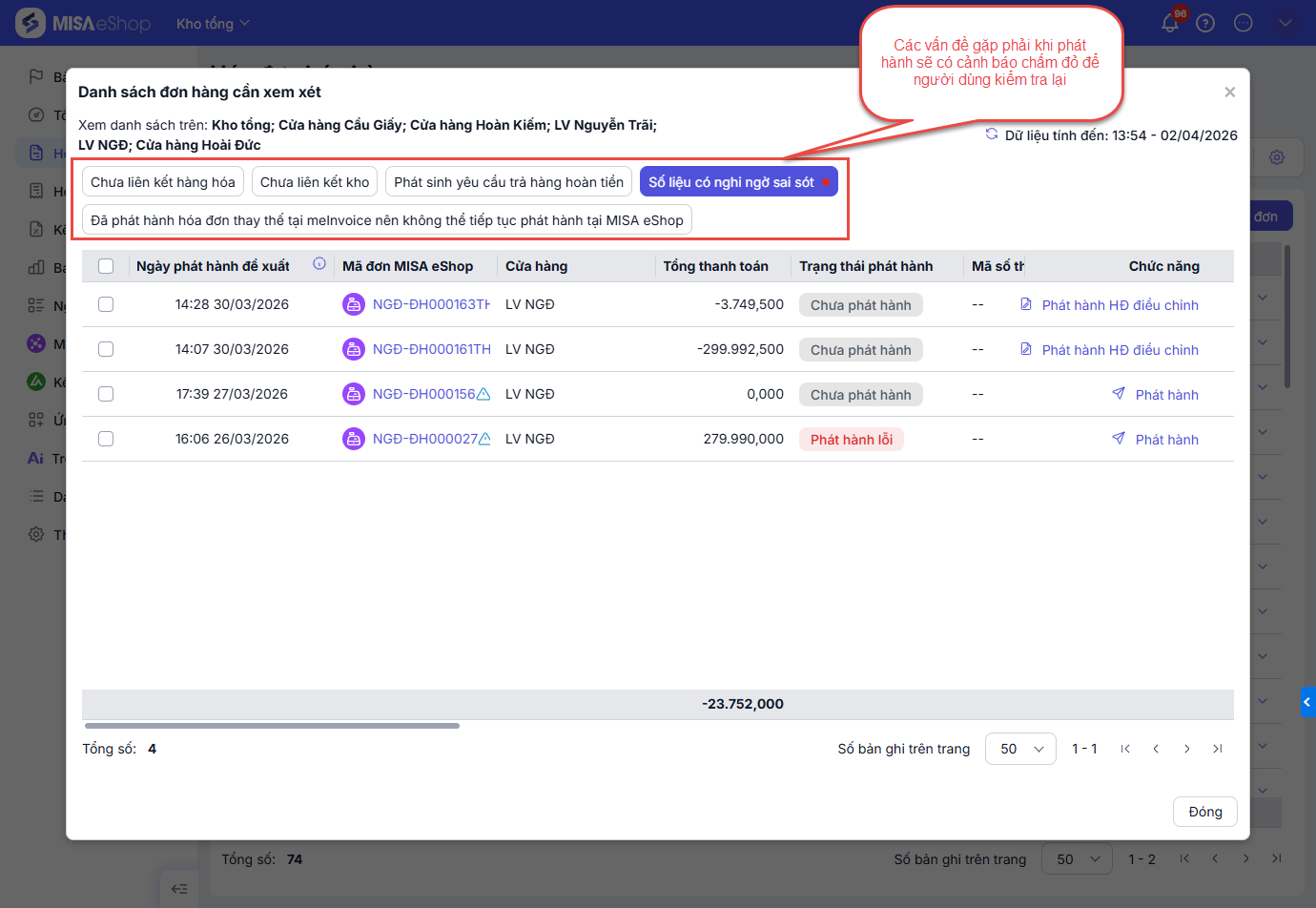 - Phát hành đơn hàng cần xem xét: Với các đơn hàng đã kiểm tra, được người dùng không đánh giá là lỗi -> Người dùng cần chủ động tự phát hành hóa đơn: