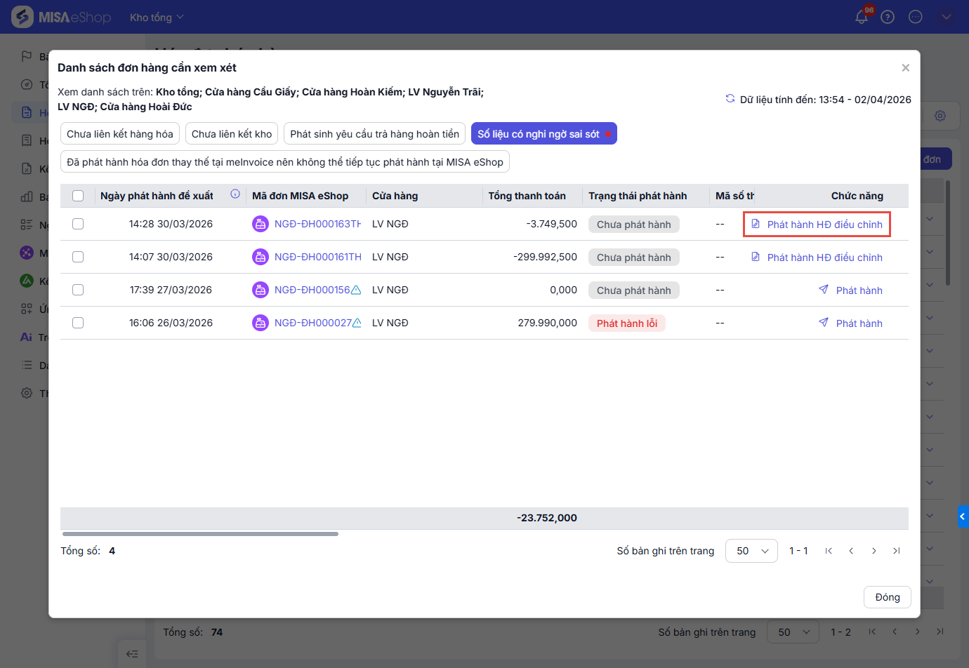 - Hệ thống lấy lên tất cả các hóa đơn chưa phát hành (Chưa phát hành, đang phát hành, phát hành lỗi) trên toàn chuỗi.