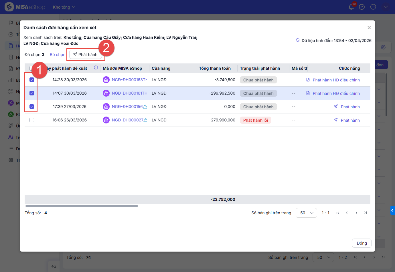 - Tích chọn hàng loạt các đơn hàng hợp lệ để phát hành -> nhấn Phát hành để phát hành hàng loạt đơn hàng.
