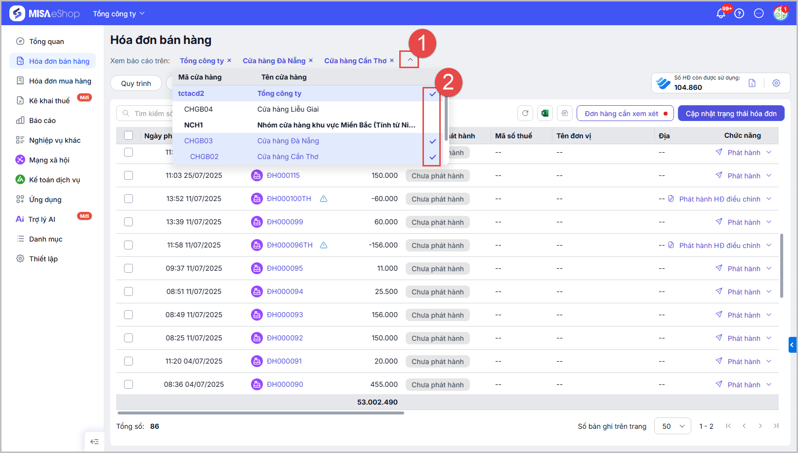 Danh sách hóa đơn bán hàng chỉ hiển thị tại cửa hàng Tổng công ty khi thực hiện kết nối MISA meInvoice được áp dụng cho toàn chuỗi.