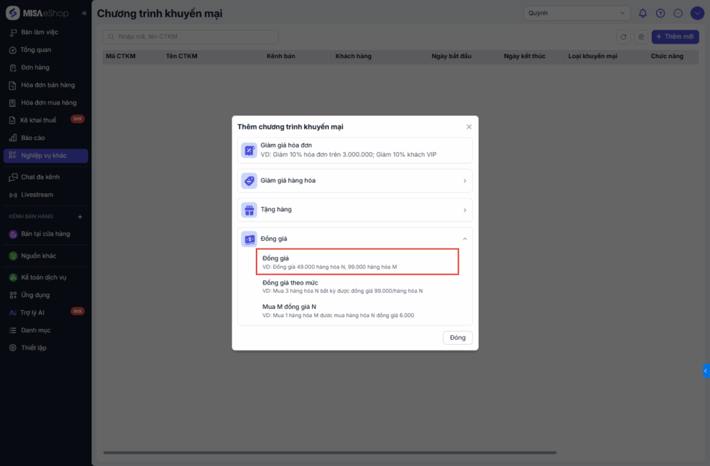 Bài viết hướng dẫn cách tạo và thiết lập chương trình khuyến mại dạng Đồng giá trên MISA eShop. Nội dung bao gồm các bước chọn chương trình, khai báo thông tin, thiết lập phạm vi, thời gian, điều kiện áp dụng và hình thức đồng giá.