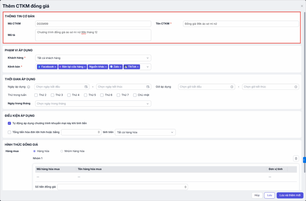 - Mô tả: ghi chú mục tiêu, phạm vi hoặc lưu ý để phân biệt với các CTKM khác.