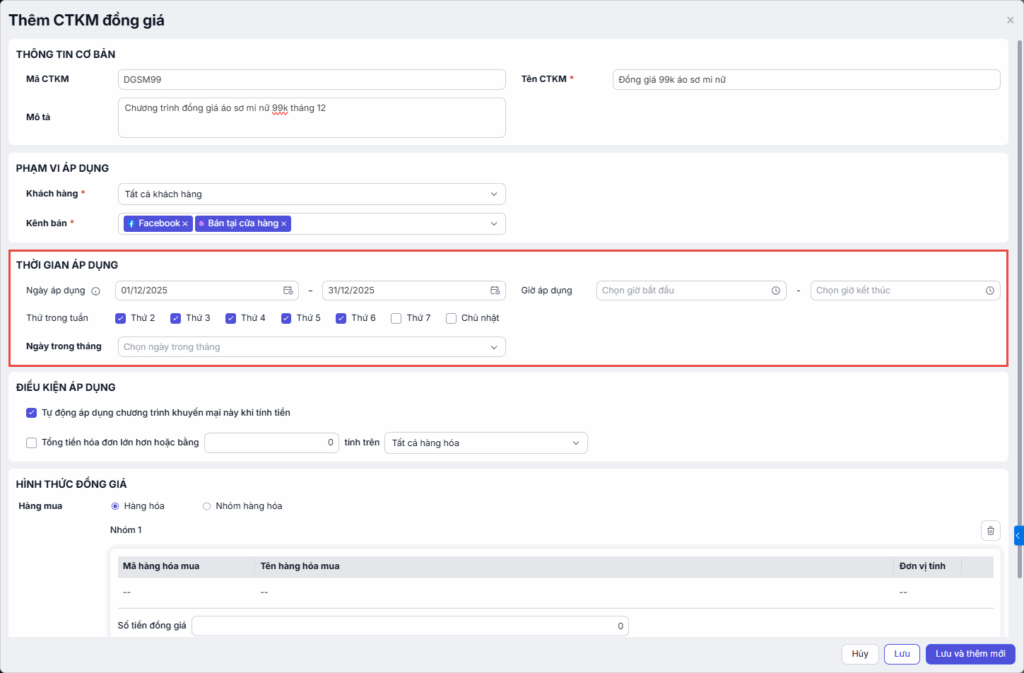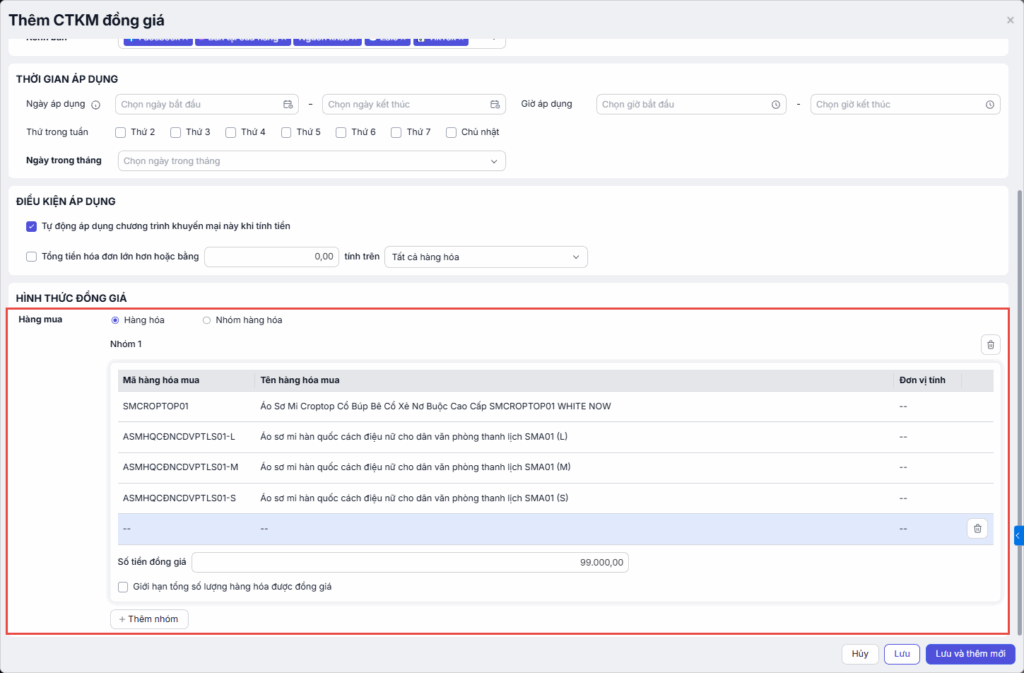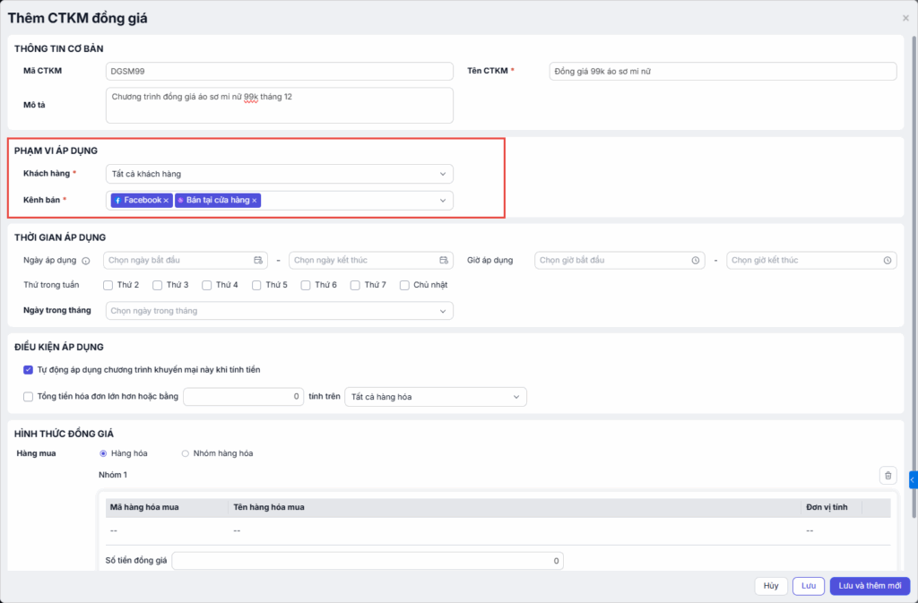 Nhấn Lưu hoặc Lưu và thêm mới để kích hoạt chương trình khuyến mại.