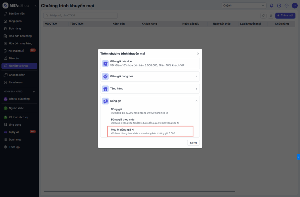 Bài viết hướng dẫn thiết lập chương trình khuyến mại dạng Đồng giá theo mức trên MISA eShop. Nội dung bao gồm các bước khai báo thông tin cơ bản, thiết lập phạm vi, thời gian, điều kiện áp dụng và hình thức đồng giá.