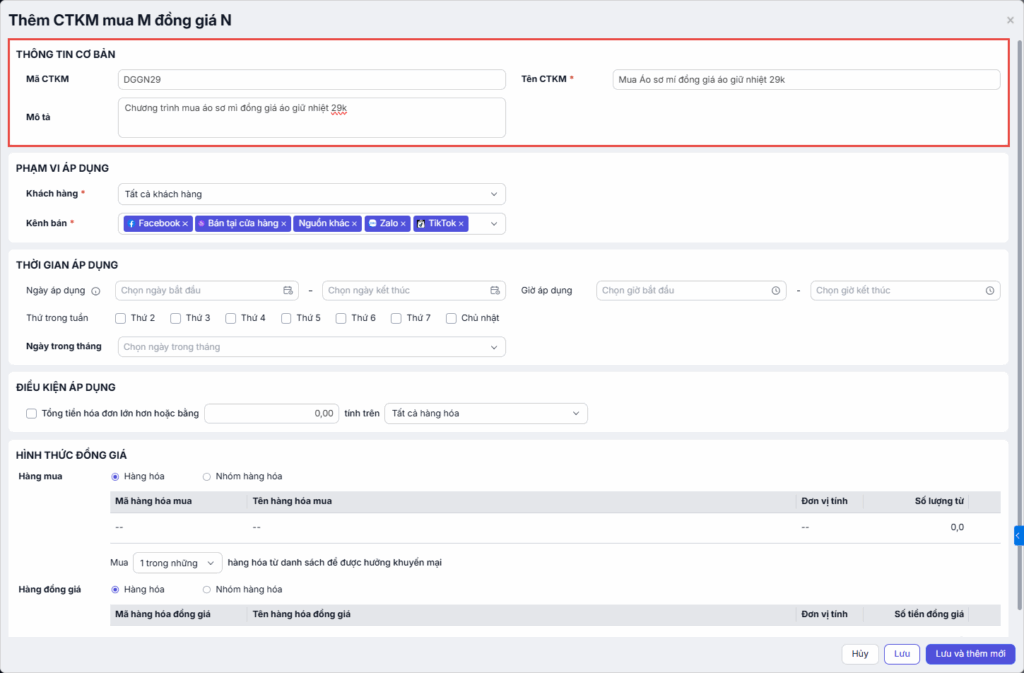 - Mô tả: ghi chú mục tiêu, phạm vi hoặc lưu ý để phân biệt với các CTKM khác.