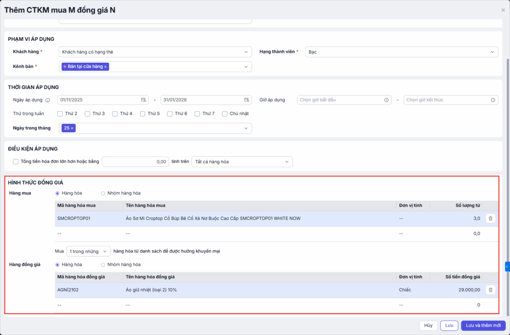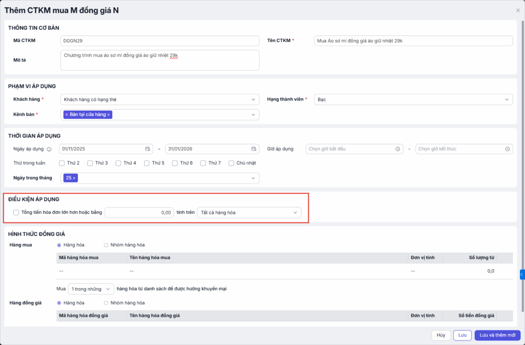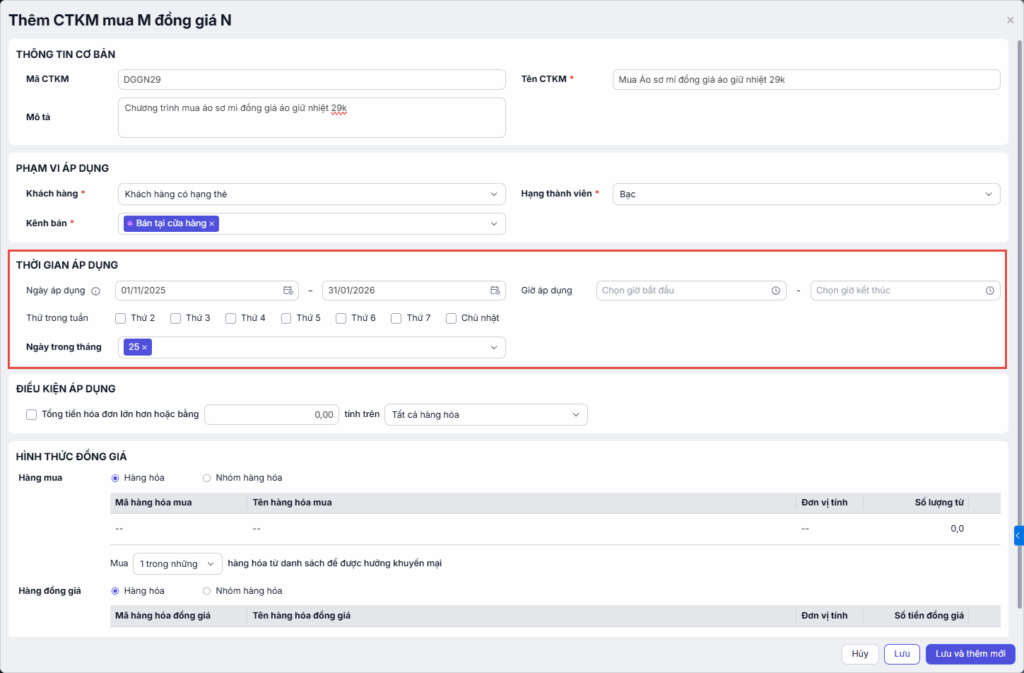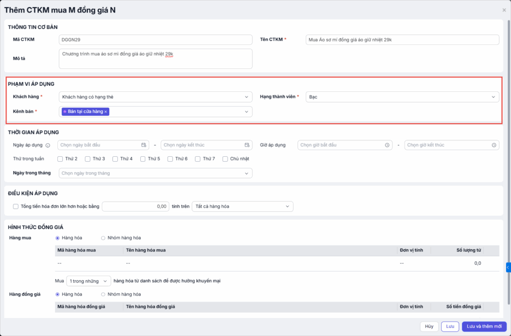 Nhấn Lưu hoặc Lưu và thêm mới để kích hoạt chương trình khuyến mại.