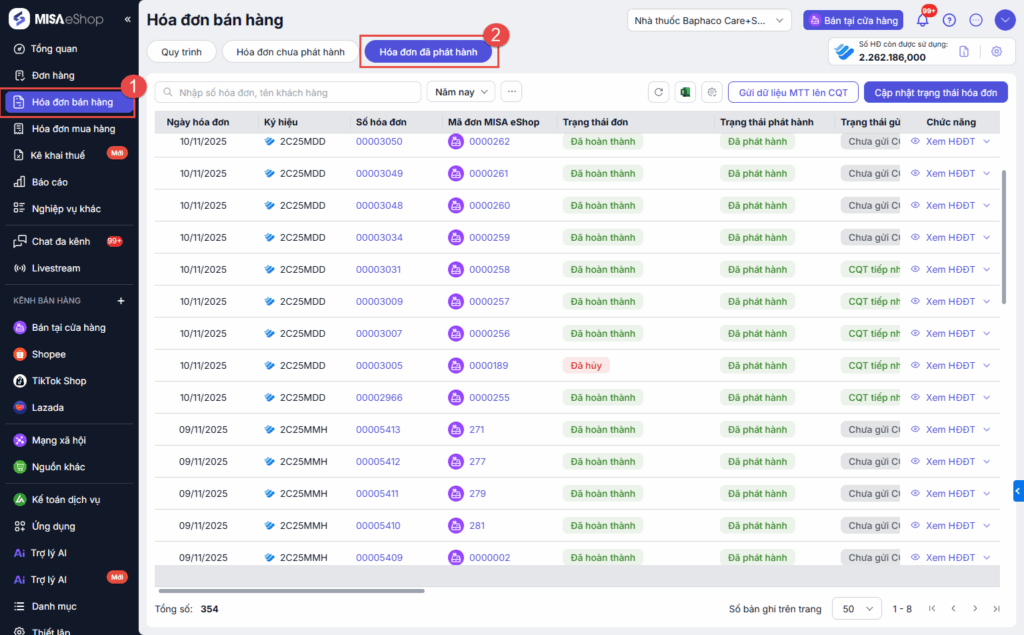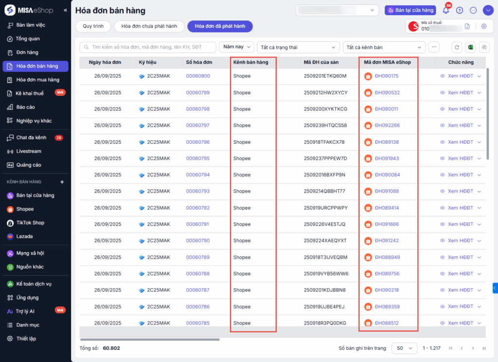 – Danh sách hóa đơn đã phát hành thể hiện rõ các mục: