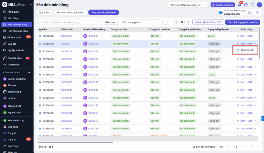 – Để gửi email hóa đơn tới khách hàng, tại dòng hóa đơn cần gửi, nhấn biểu tượng