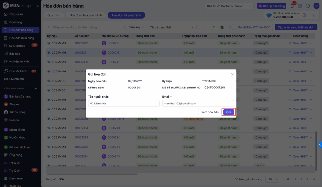 Bài viết hướng dẫn cách quản lý hóa đơn bán hàng và gửi hóa đơn điện tử qua email trên nền tảng MISA eShop. Nội dung bao gồm thao tác tra cứu danh sách hóa đơn đã phát hành, xem chi tiết hóa đơn và thực hiện gửi email hóa đơn đến khách hàng.