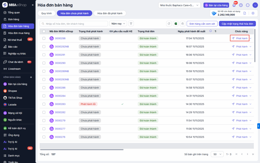 Bước 1: Tại hóa đơn cần phát hành, nhấn Phát hành.
