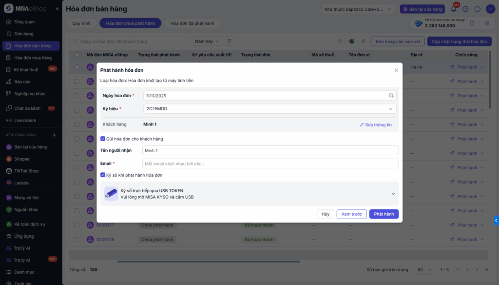 - Nhấn Xem trước HĐ để xem trước hóa đơn trước khi phát hành.