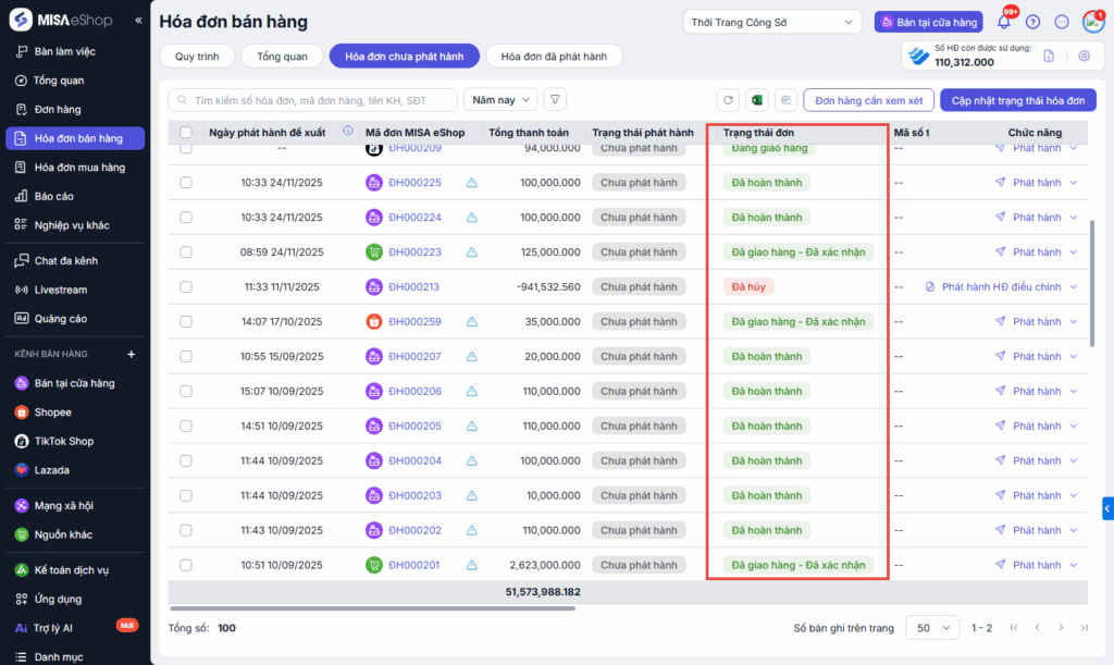 - Mã đơn MISA eShop: Mã đơn hàng tương ứng trên hệ thống.